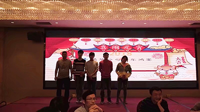 在晚宴開始前由我們公司兩們主持人開場,在由我們公司總經(jīng)理邱總進(jìn)行晚宴演講:之后我們就正式開始晚宴,在晚宴期間我們公司為我們公司的優(yōu)秀員工、全勤員工、五年忠誠員工、十年忠誠員工進(jìn)行了頒獎典禮;中間我們還進(jìn)行了抽獎活動,我們獎項分別:特等獎2名,每人3500;一等獎8名,每人1200;二等獎20名,每人800;三等獎30名,每人300;沒中獎的是其他員工都有安慰獎,每人100.我們還讓公司員工上臺進(jìn)行了各種游戲活動,我們晚宴由晚上17點開始到21點半左右結(jié)束;我們每個員工心滿意足的走出了宴會廳。