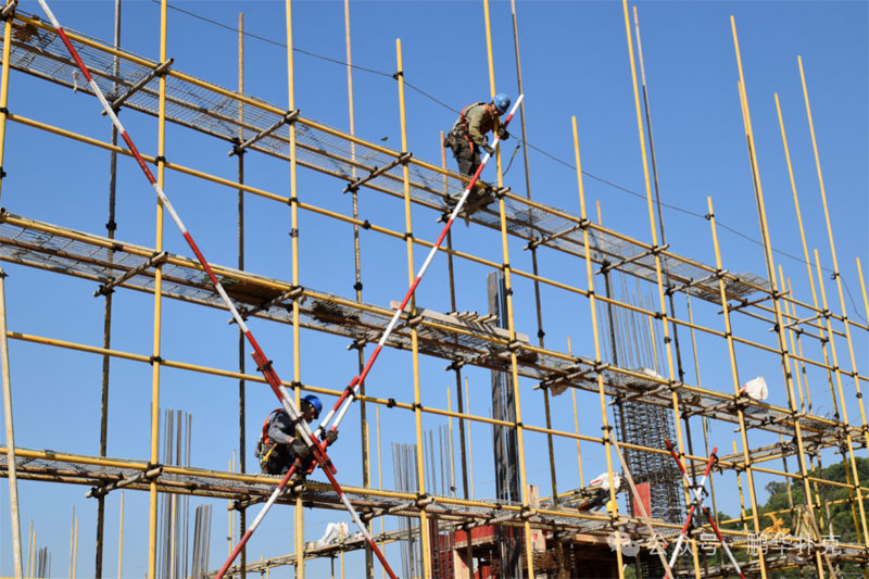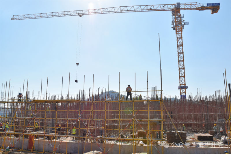 施工現(xiàn)場(chǎng),塔吊高聳,機(jī)器轟鳴,工人們佩戴安全裝備,在鋼筋水泥間穿梭,建設(shè)工作熱火朝天、繁忙而有序。